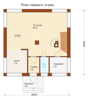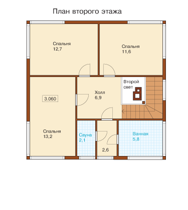 Современный коттедж спроектирован для проживания в нем небольшой семьи, состоящей из 2 -3 человек. Минимальная площадь застройки позволяет возвести его на участке малых размеров. При этом в доме предусмотрены абсолютно все условия для комфортного проживания и отдыха. Центральное место первого этажа занимает просторная гостиная с уютным камином и лестницей. На втором этаже располагаются три спальни, санузел с сауной и небольшой холл.