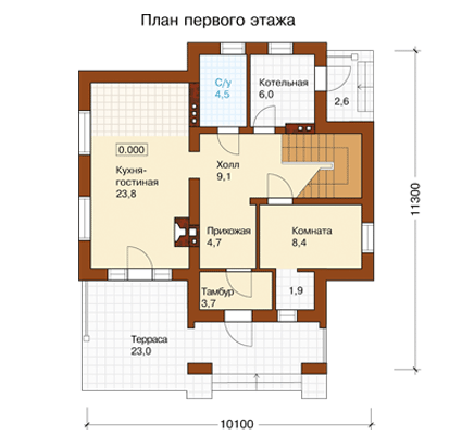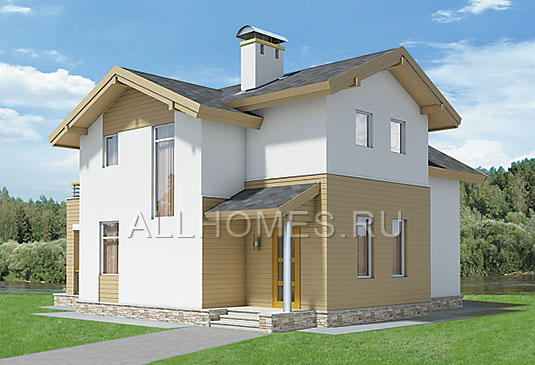 Этот небольшой загородный дом имеет полезную площадью 131,4 м2. Он может стать местом постоянного проживания семьи из 3-4 человек. Для визуального увеличения внутреннего пространства кухня и гостиная объединены в единое помещение, из которого запроектирован выход на просторную открытую террасу. На мансардном этаже закомпанованы три спальные комнаты и два санузла. Комната запроектированная как родительская спальня оборудована гардеробом и имеет выход на отдельный балкон. На первом этаже кроме зоны общего пользования предусмотрена жилая комната с небольшой гардеробной. Для лучшего сохранения тепла основной вход в дом проходит через тамбур, а вход с заднего двора - через котельную.