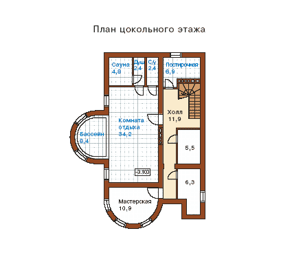 Загородный коттедж с цокольным этажом рассчитан на постоянное проживание семьи из 3-5 человек. Проект предусматривает строительство дома на ровном участке с низким уровнем грунтовых вод. В цокольной части дома запроектированы бытовые, технические и вспомогательные помещения. Гараж на один автомобиль, а также котельная, расположенные между уровнем цоколя и первого этажа, пристроены к основному объему строения, при этом их архитектурное решение выполнено так, что они являются гармоничным продолжением всего сооружения. На первом этаже расположены кухня- столовая, гостиная с выходом на веранду и на террасу. На втором этаже предусмотрены три спальни и ванная. Самая большая спальня имеет два балкона.