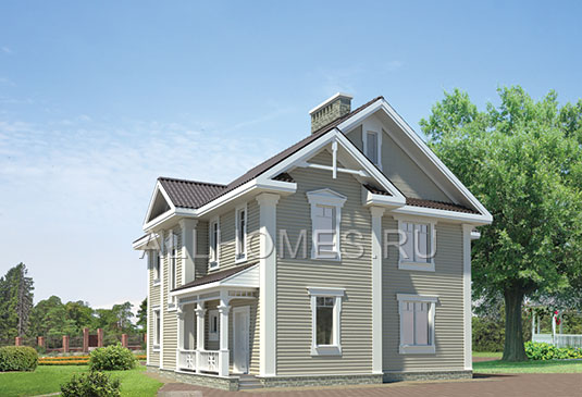 Уютный коттедж с двумя полноценными этажами и угловой крытой террасой рассчитан на проживание семьи из 5-6 человек. Простые архитектурные формы коттеджа выглядят нарядно и привлекательно за счет хорошо прорисованных деталей фасадов: двух эркеров, угловых пилястр, обналички дверных и оконных проемов, ажурных ограждений входной крытой террасы. По планировочному решению проект дома достаточно прост и логичен. Угловая терраса является крыльцом главного входа и местом отдыха на воздухе, с дополнительным удобным входом в гостиную. Так же на первом этаже запроектированы холл, гардеробная, спальня, санузел и котельная со своим крыльцом. Второй этаж отведен под четыре жилые комнаты и два санузла.