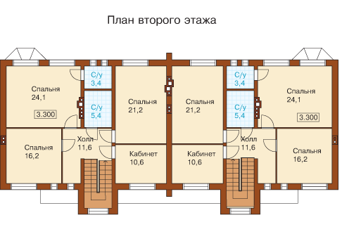 Проект блокированного типа коттеджа, рассчитан на постоянное проживание достаточно большой семьи, состоящее из 6-10 человек. Главным достоинством данного типа коттеджа является возможность пристраивать такие же коттеджи к уже построенным, что дает возможным размещать несколько поколений одной семьи или разные семей одновременно. Дом имеет два симметричных корпуса со встроенными гаражами и предполагает строительство на ровной территории.